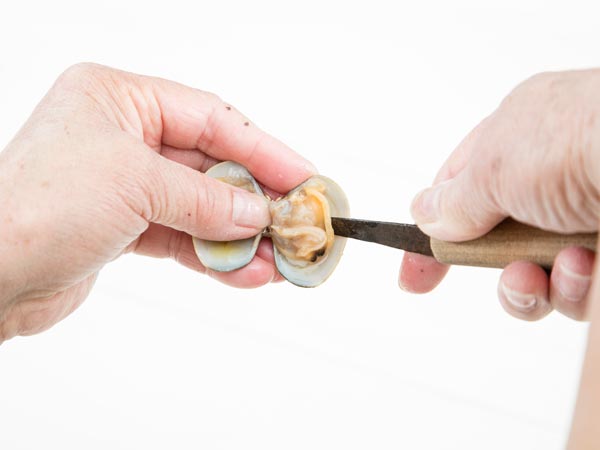 ③アサリには、二本の貝柱があるため、下側の殻に沿うようにナイフを動かし、1本目の貝柱を切り離す。